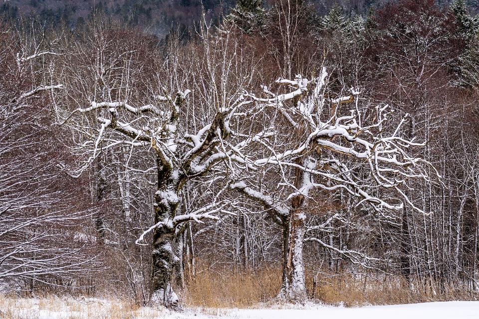 Zwei knorrige Bäume mit frischer Schneeauflage